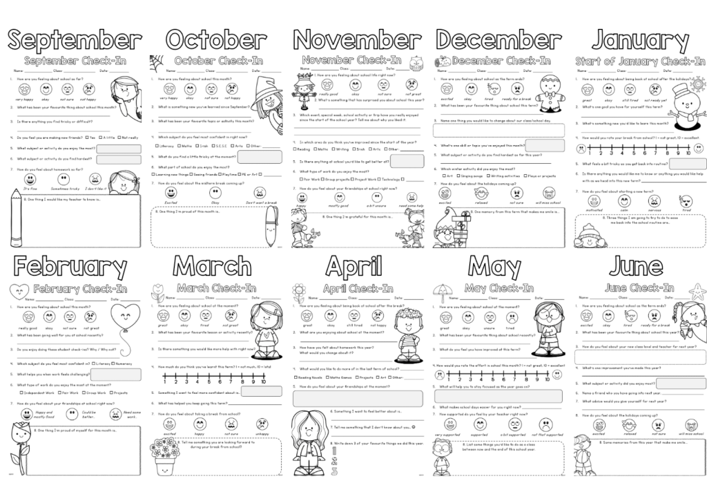 Get a full year of monthly student check-ins to use with your class! These are a simple way to build connection, reflection and classroom community.