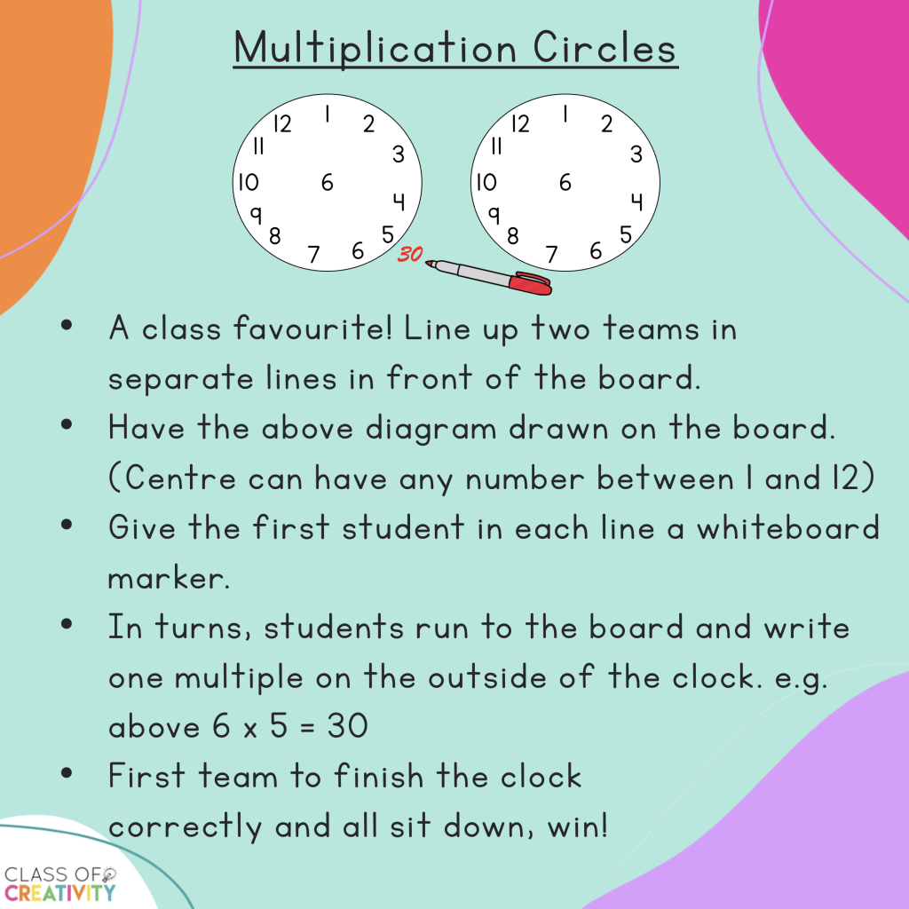 🍎Multiplication Circles – great for 3rd upwards. Students will begin to strategise once they get used to the game (maybe filling the trickier number multiples first etc). You can also play with two different numbers in each circle to make it trickier for each group (no peeking at the other team’s circle!)