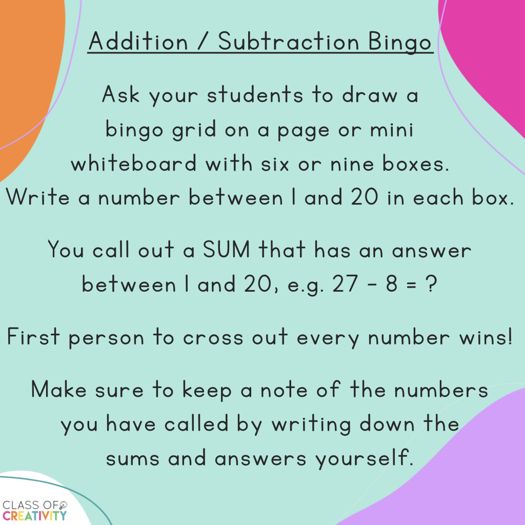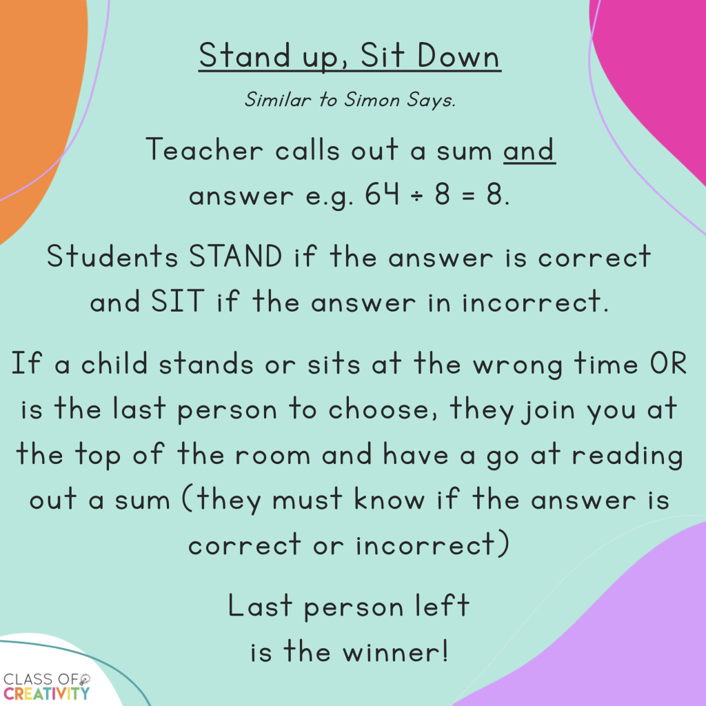 🍎Stand up, Sit Down – have the students who are knocked out to stand in a line at the top of the room and call out the sums. It’s a good idea for every child to hold a mini whiteboard to complete their sums in the senior end. Students waiting in line can be double-checking their trickier sums.