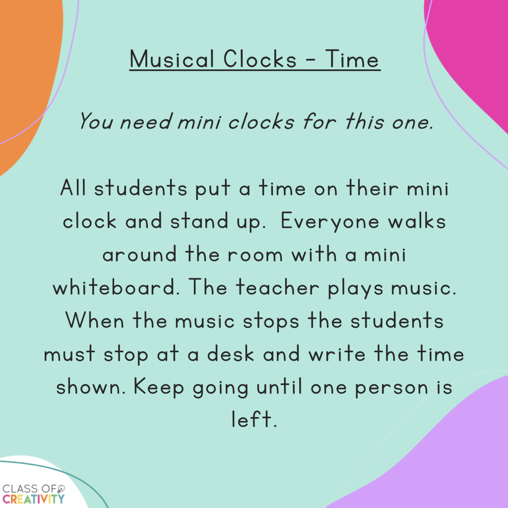 🍎Musical Clocks – you will have to check everyone’s answer against their clock but you can get students who are knocked out to help check after each round. Change every clock before the final to make it harder!