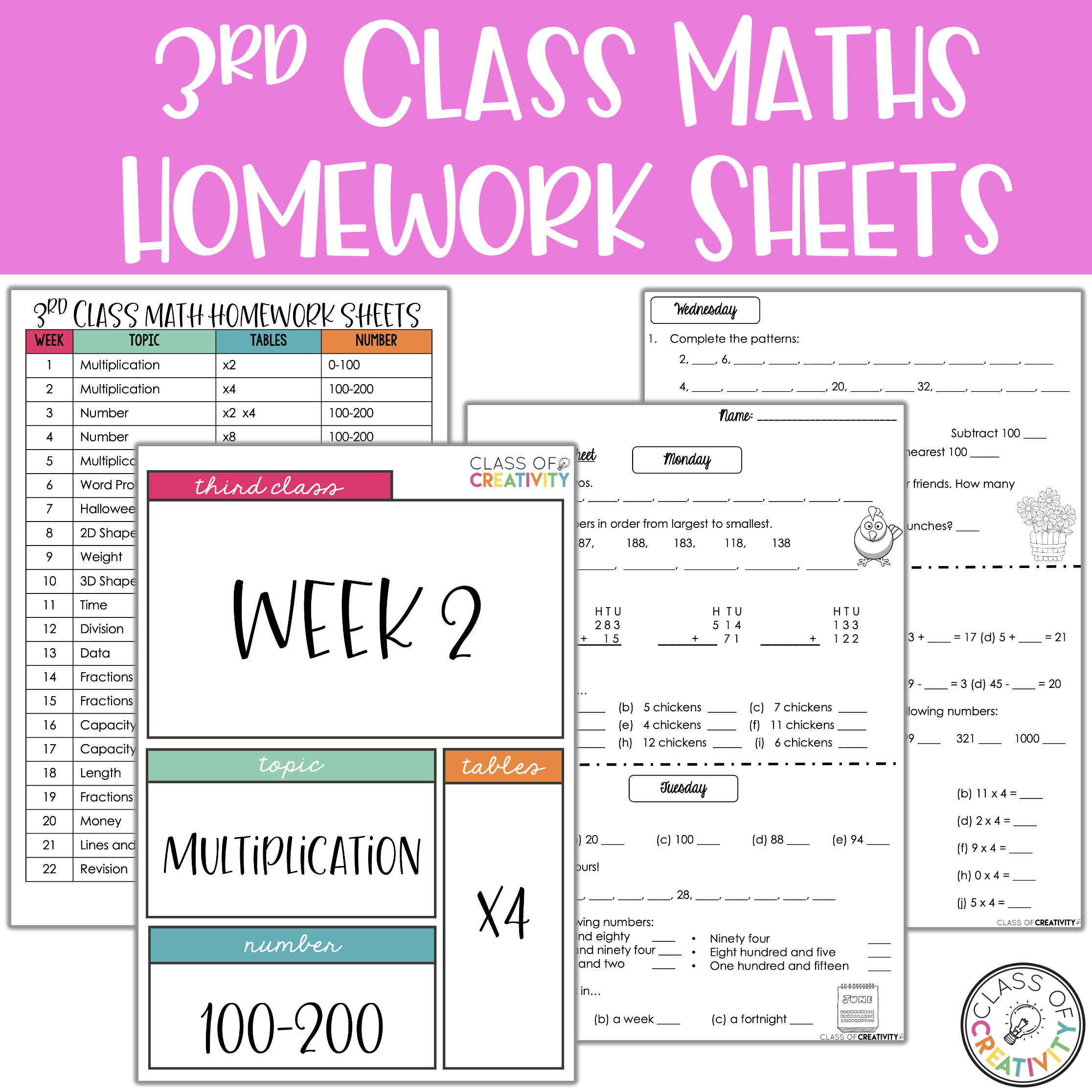 This comprehensive set of Math Homework sheets is the perfect addition to any 3rd Class! You can use this workbook as morning focus work, testing, early finisher work or math homework sheets!